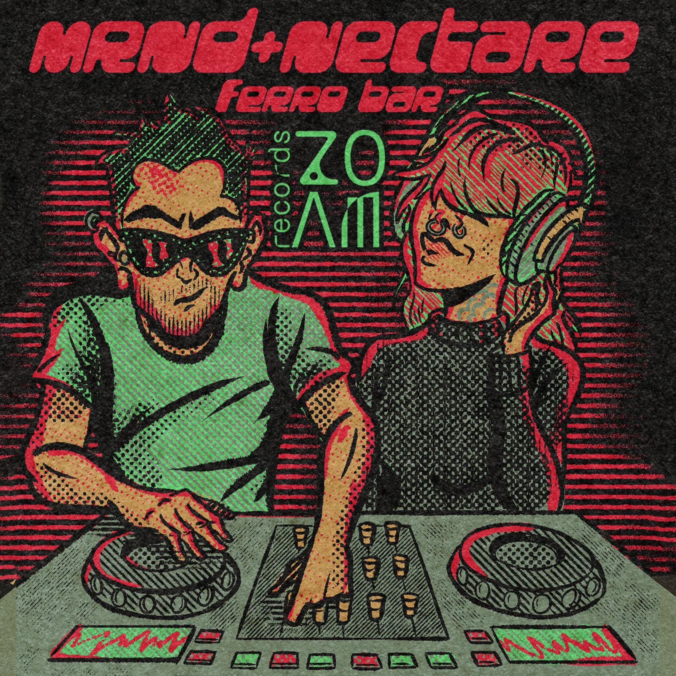 Promotional illustration for an electronic music event at Ferro Bar in Porto, Portugal, featuring DJs MRND and Nectare